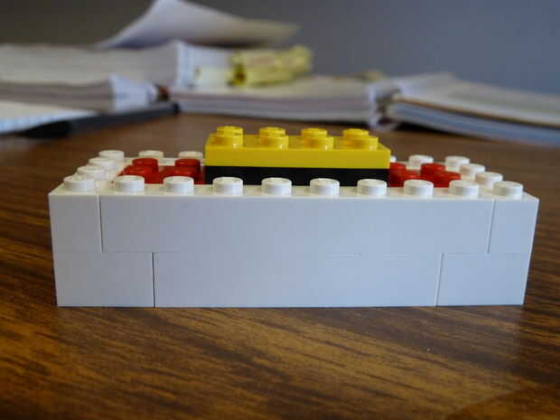 este modelo de la parte delantera de una casa de Lego es rápido y fácil de hacer. Podrá disfrutar de sus hijos lo ha construido en ningún momento.Materiales necesarios:1:16 x pieza base 16 clavija verde7: 2 x 4 piezas clavija azul1: 2 x trozo de peg