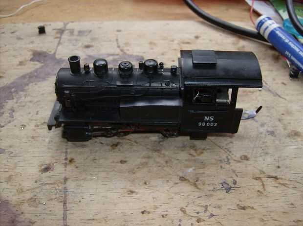 modelo de tren que tiene ruedas de trabajo y un lugar para más coches del tren