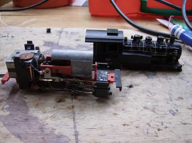 modelo de tren que tiene ruedas de trabajo y un lugar para más coches del tren