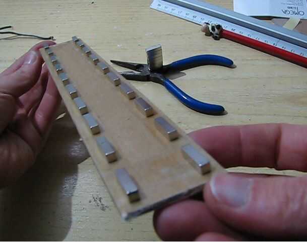 10) 20 imanes de neodimio de tamaño 15x4x4mm, magnetizada perpendicularmente a un lado de 15 x 4