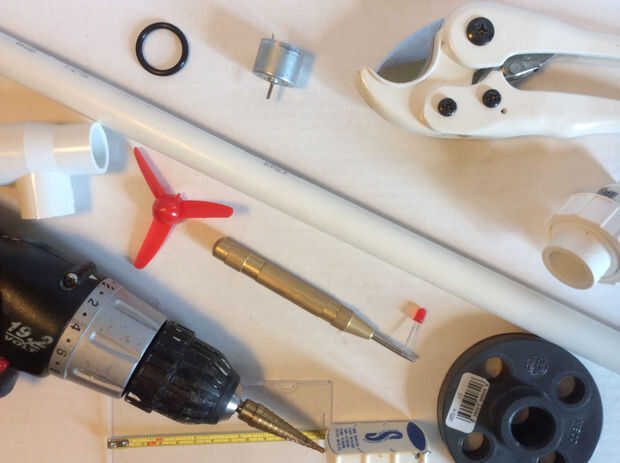Marca Motor, pluma, rojo LED, de madera o plástico, 3/4 x 1/2 x 1/2 tubo de PVC conexión t, 1/2" pegamento de Unión, caliente, perforar con poco, láminas, 1/2 brida, cortadores de tubería de PVC, Punch, junta tórica, cinta métrica, 1' de 1/2 pipa del PVC, viento ;-)