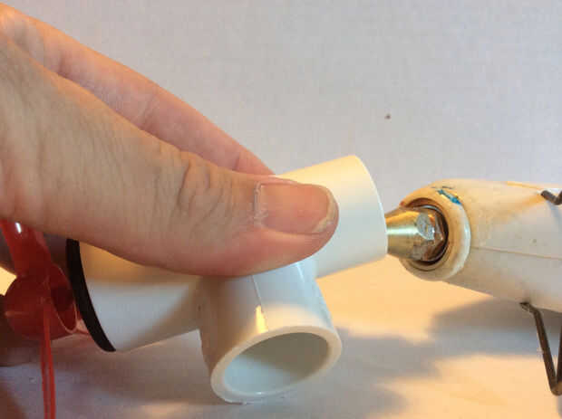 Mantiene el motor y el tubo de PVC en lugar, agregue el pegamento caliente.