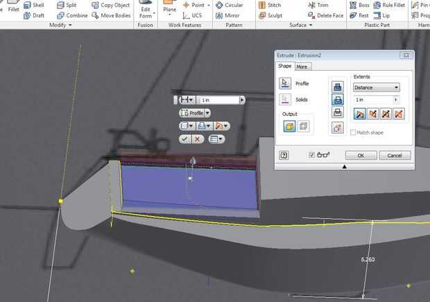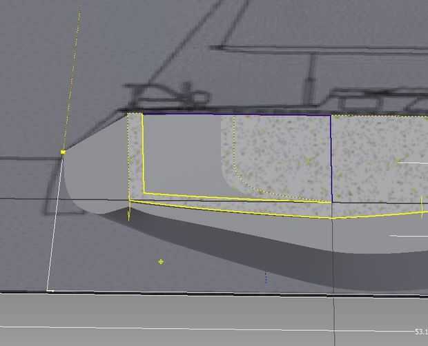 Siguiente comencé a trabajar en algunos detalles del habitáculo. He creado un plano de trabajo en el avance dentro de rincón de la brazola de la bañera y comenzó un bosquejo. Proyectó el borde de la brazola y cabina para obtener un contorno de la cabina. He creado otro plano paralelo baja.4 pulgadas ya que es más o menos donde quería la superficie de los asientos a ser. Desde aquí proyecta el contorno de la cabina y sacó hacia arriba como un corte para quitar el material por encima de los asientos.