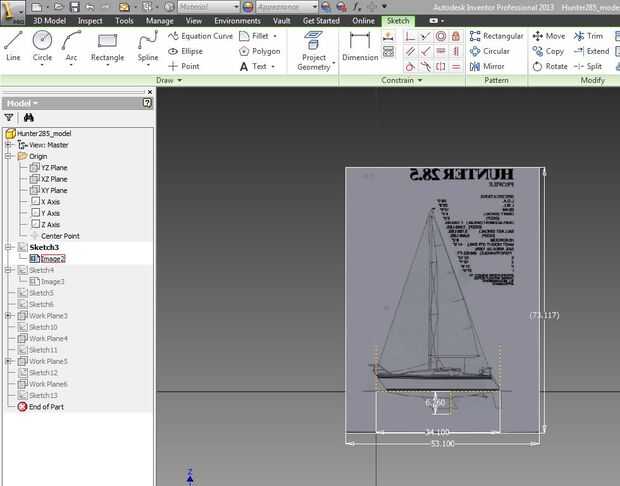 Crear un boceto e insertar la imagen de la vista de lado. Dibuja unas líneas con dimensiones conocidas. En esta imagen dibujé las líneas de la longitud total del casco que en escala es de 34,1 pulgadas. El proyecto del barco es de 6,26 pulgadas de escala. I importados la imagen y luego la amplió para que la imagen está alineada sobre la línea de longitud total y la línea de proyecto.