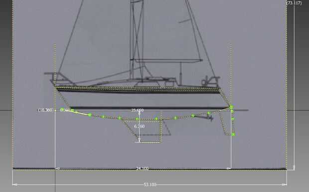Siguiente bosquejó el contorno general del casco en la vista lateral. Lo hice básicamente trazando el contorno con líneas rectas para la quilla y curvas polinomiales para el casco.