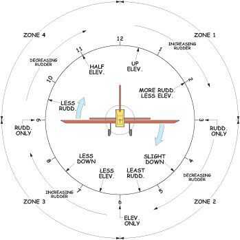 Usando la analogía del reloj (esta vez con la aleta como punto de referencia), el modelo es nivelado y vertical cuando los puntos de la aleta a las 12.00 horas, siendo ganado altura con ascensor. Por el contrario con la aleta apuntando a 6.00, se gana altura usando abajo ascensor. Cuando la aleta 3.00 o 9.00 es efectivamente en el filo de la navaja y 'timón superior' tiene que ser utilizado para ganar altura, usando el timón como un elevador para levantar la nariz. ¿En términos simples, a las 12.00 o 6.00 no necesita timón y 3.00 o 9.00 no necesita elevador, pero necesidad de la transición de una entrada a otro a través de los cuartos... sonido muy complicado?