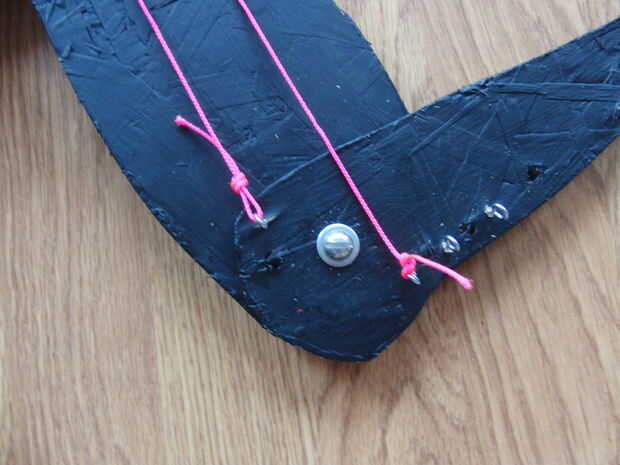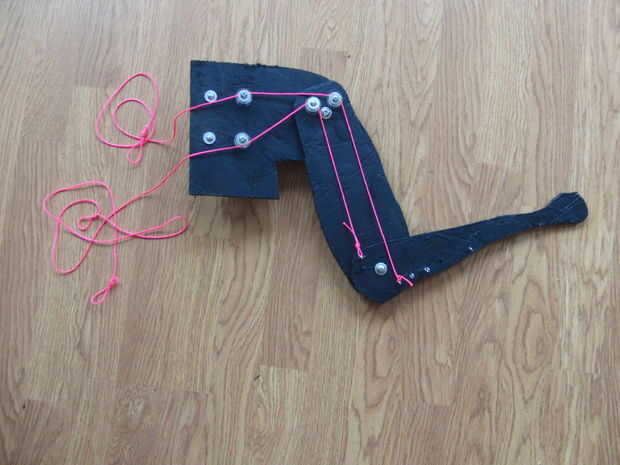 Uno va a lo largo de la parte posterior del brazo y el otro la parte frontal del brazo. Atan lazos en el extremo de la cuerda para permitir que una escala de fuerza conectarse fácilmente en los extremos de las cuerdas para controlar cuánta fuerza se requiere para los diferentes movimientos del brazo.