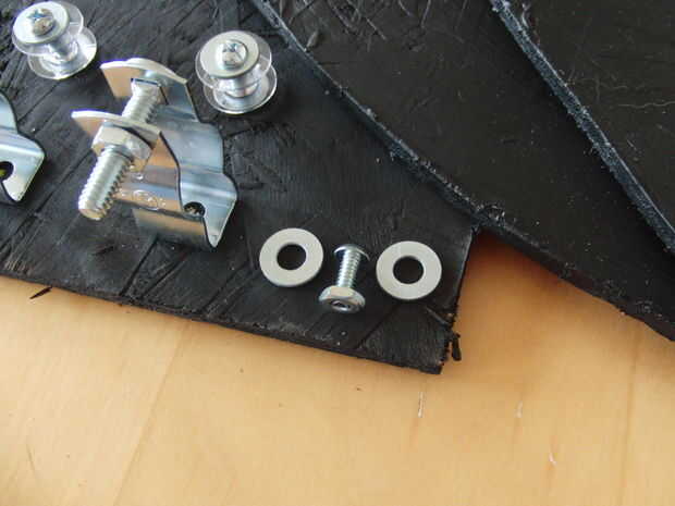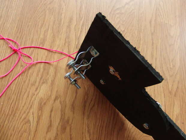 Me pre-perforados los agujeros en la madera contrachapada y utiliza arandelas, tornillos y tuercas para fijar la abrazadera.