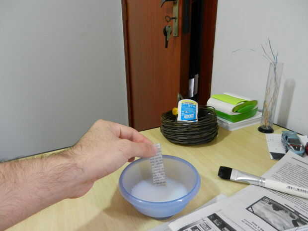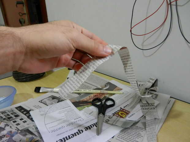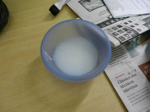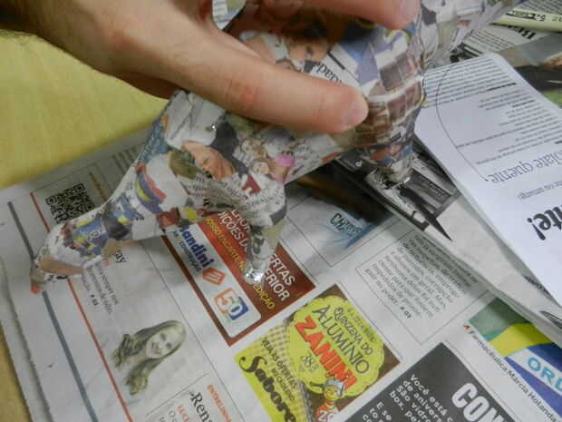 Cortar algún diario en pequeños trozos y hacer una mezcla con el pegamento y el agua (aproximadamente 1 de pegamento a 4 de agua).