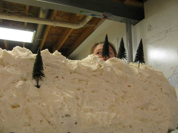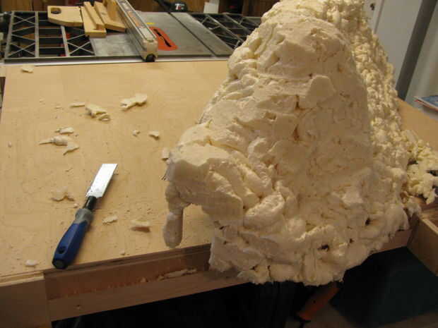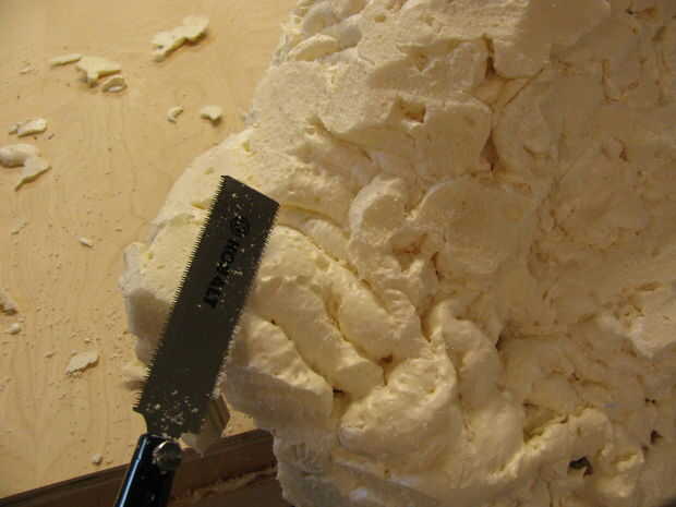 Utilicé una sierra de dientes finos tire para esculpir las caras de la roca. Funcionaba bien porque era lo suficientemente larga para cortar caras amplia. Su forma de trabajo a través de la corte toda montaña las secciones redondeadas de "lava-como" de espuma en aerosol. Tenga cuidado de no cortar demasiado profundo, no desea que el cable de pollo para demostrar a través.