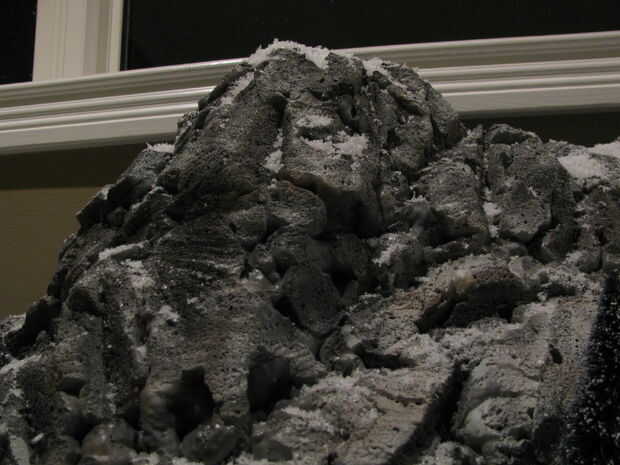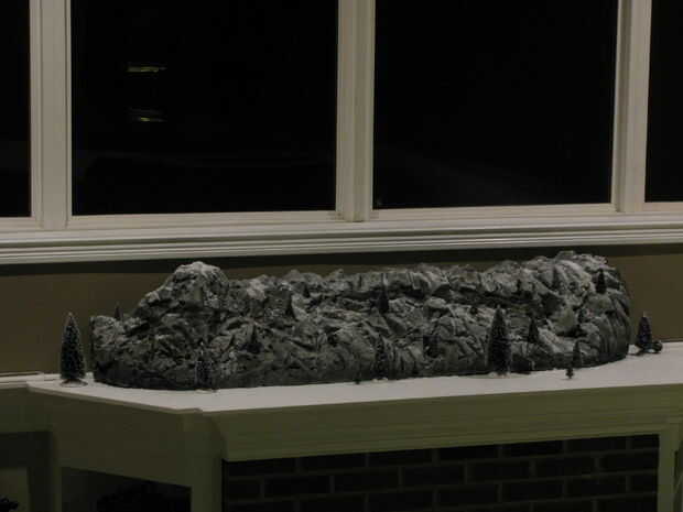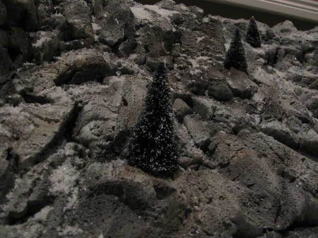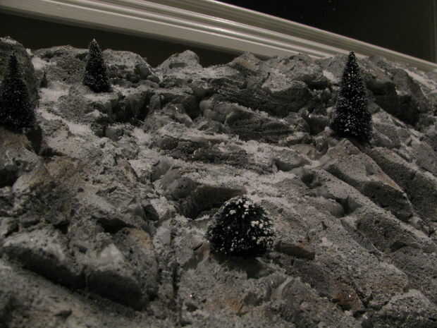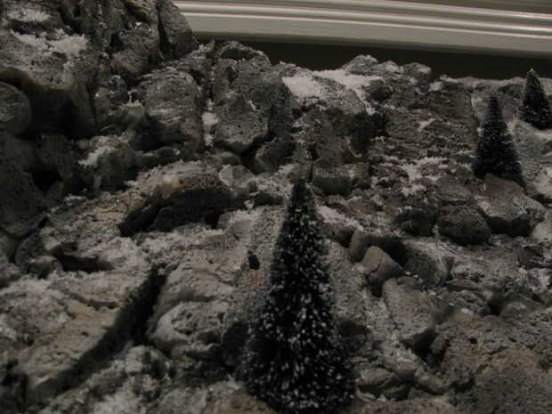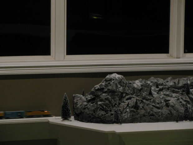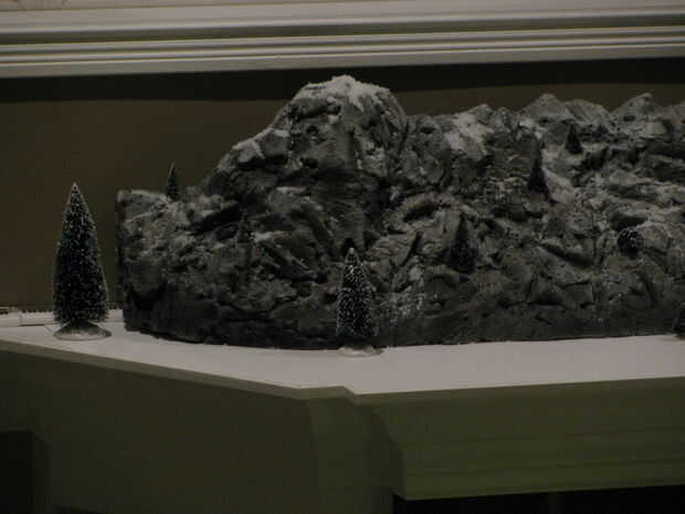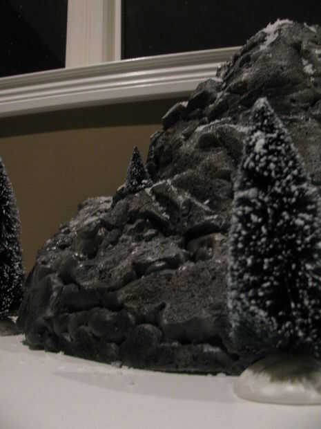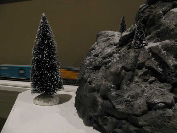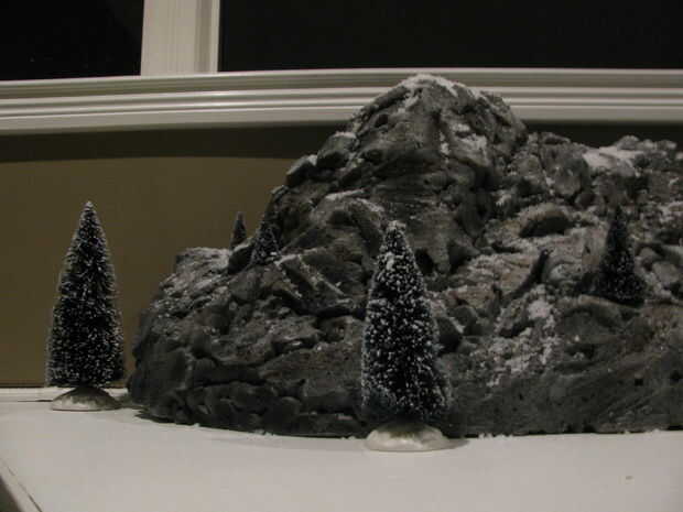 Encontré algunos nevados árboles que mi esposa había comprado hace años para un pueblo de la Navidad, retirar las bases y atrapado en la espuma. También se colocan árboles a lo largo de lado la montaña para completar el efecto.