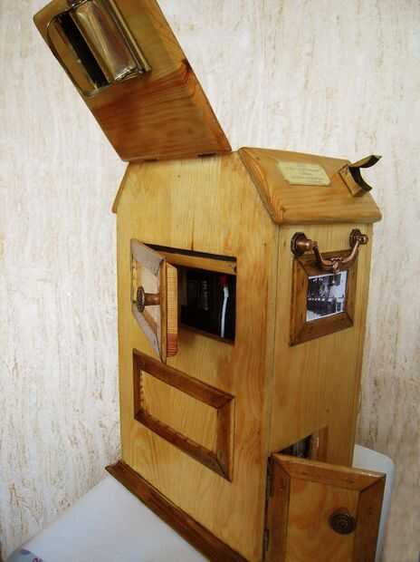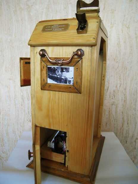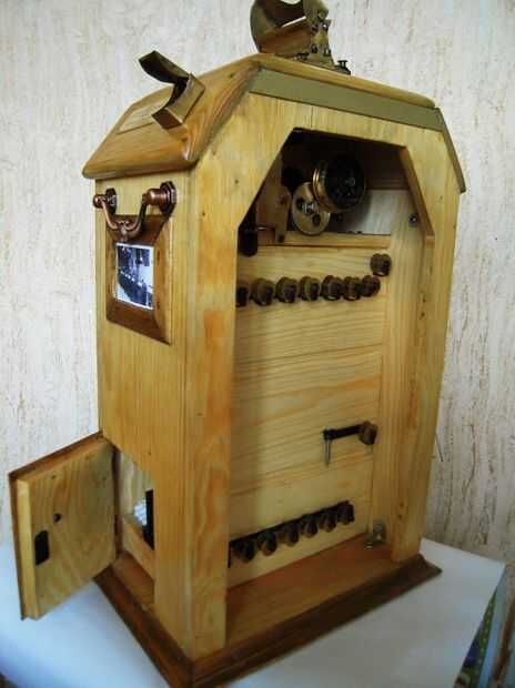 Actualmente, estoy terminando trabajo en un modelo de "Kinetoscopio" en una escala de 1 x 3. Este modelo tiene las dimensiones: altura - cm.width 40 - 15 cm., largo - 25 cm. El modelo está hecho de madera - pino 14 mm de espesor. Motor - 12 voltios, 25 watts. Fuente de alimentación: batería de 12 voltios. El formato de la película - 8 mm. Después del trabajo, le dirá cómo hacer un aparato de esos en un taller casero.