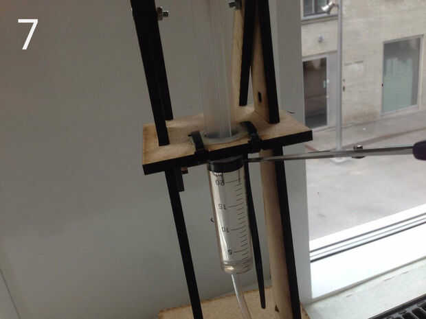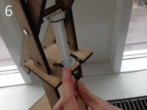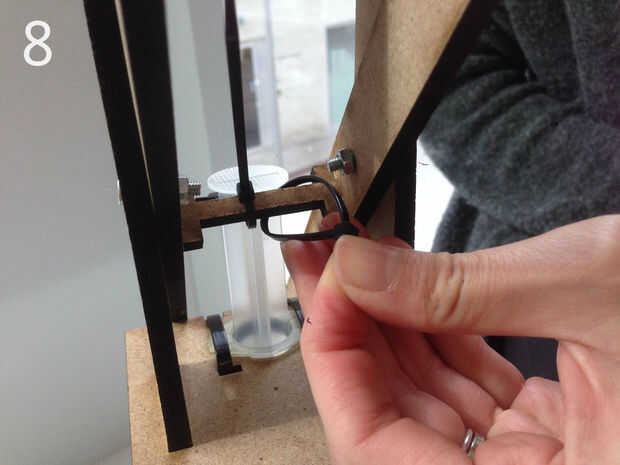 6. Tire de las tiras de 5 mm a través de los recortes en la placa media, asegurándose de cubrir la base de la jeringa. Apretar la jeringa es incapaz de moverse. Attactch 3mm tira a la parte superior del pistón, asegurándose de dejar suficiente holgura, para dejar dos tiras más pasar por el bucle.