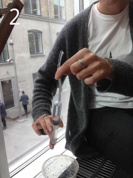 2. girar sobre y attatch el tubo de la boquilla de la jeringa y empuje que el aire.