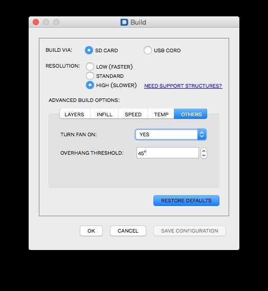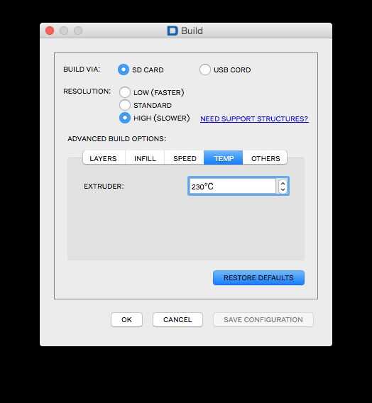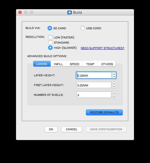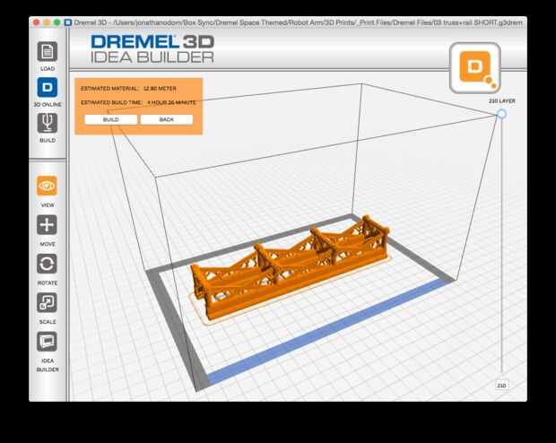 CONSTRUIR capas de ajustes: usé resolución: alta para todas las impresiones. He tenido buenos resultados sin ajustar cualquiera de las otras opciones de esta ficha. RELLENO: usé patrón llene: hexagonal para todos los modelos. Se ha cambiado la densidad del defecto 35% en algunos de los modelos. Descubrí que en partes más pequeñas, densidad de 75% para las piezas mucho más robustos. VELOCIDAD: La configuración predeterminada. TEMP: aumenté esto a 230ºC de 220 º c por defecto. Hice esto porque he tenido mejores resultados con una temperatura más alta en otras impresoras FDM, y encontré lo mismo sucedió con la Builder.OTHERS Idea de Dremel: configuración por defecto. El software le da un cálculo del tiempo de construcción y el material utilizado cuando ha hecho crear el archivo (que es impresionante). Puede enviar el archivo a la tarjeta SD o directamente a la impresora con un cable USB.