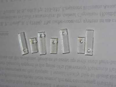 Terminé con piezas cortadas de acrílico en un cortador láser que eran 1/4 de pulgada por 3/4 pulgadas con un agujero de .4mm a poca distancia de la final de la obra.