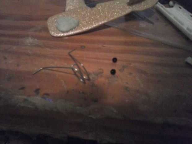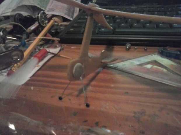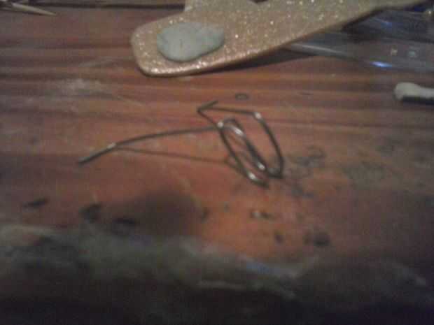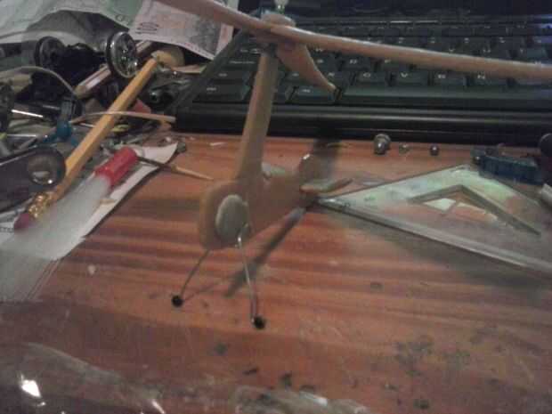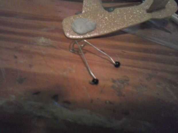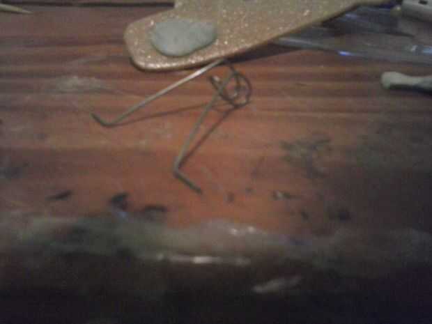 Para el tren de aterrizaje de la curva un trozo fino de alambre a la forma que se muestra. El alambre que usé fue aproximadamente de 1mm de grosor y unos 12 cm de longitud. Después de que ha sido doblada en la forma que se muestra en las 3 primeras fotos Deslice el granos de 2 ruedas en la sección doblada hacia afuera del cable y asegúrese de que el grano no se puede mover el alambre. Luego, doble el extremo del alambre hasta mantener el grano de la rueda de.
