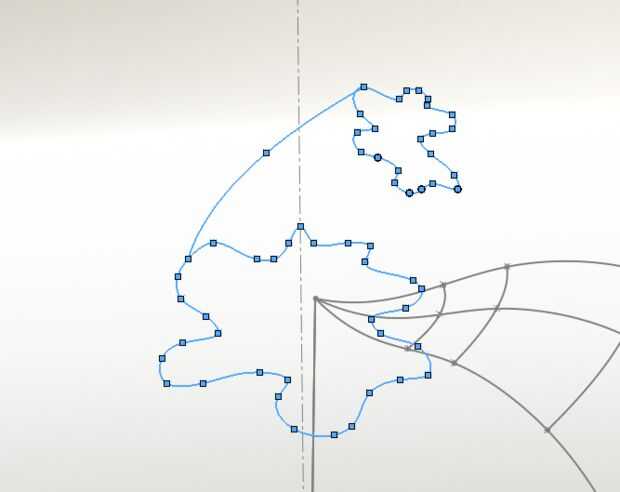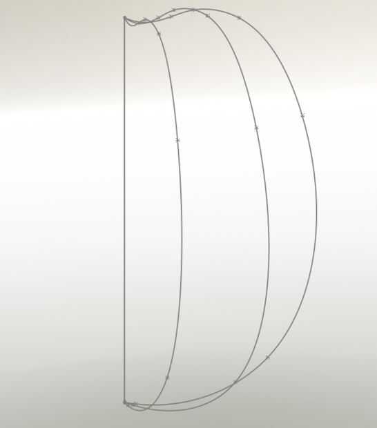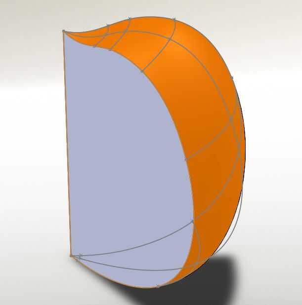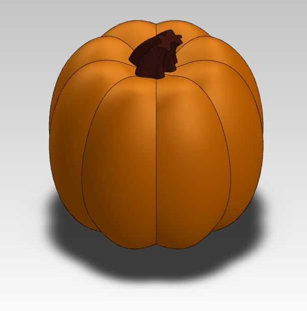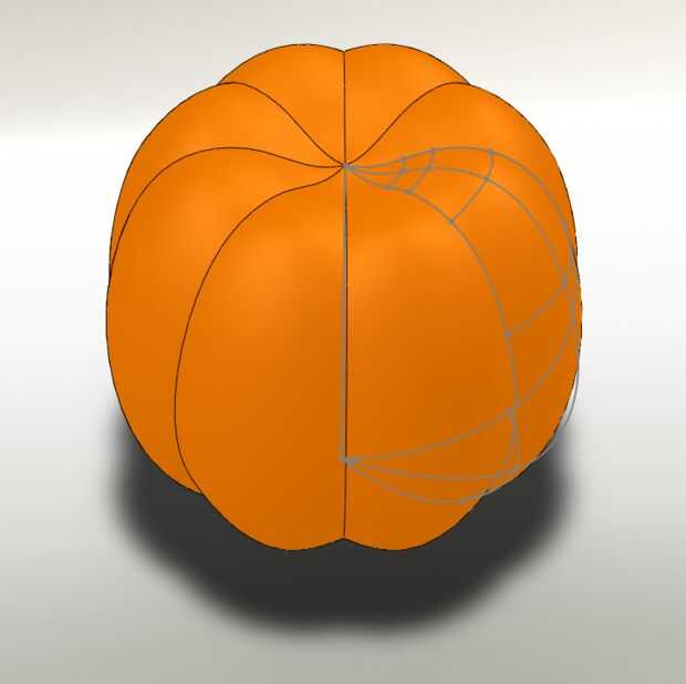 Este modelo fue creado por hacer una curva de loft único y copia esa curva a los aviones a 22,5 grados y 45 grados con respecto al plano de dibujo original. La curva media entonces fue manipulada para crear el bombeo en cada una de las cuñas de la calabaza. Curvas guía fueron creadas como splines 3D entre los nodos de las tres curvas. Para crear 1 de las 8 cuñas, las dos curvas exteriores eran abuhardilladas juntos y seguir las curvas guía que conecta los nodos. Este proceso creó 1/8 de la calabaza.