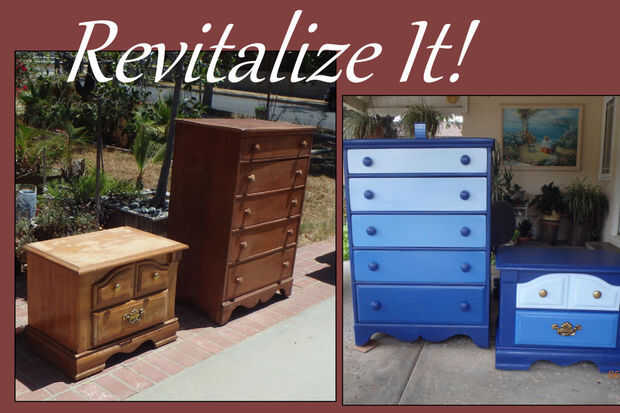 Las dos piezas de los muebles eran de buena construcción así que necesita poco repararlo, si cualquier. Tengo que lijar los cajones de la cómoda para que se deslice más fácilmente y no se atasca y tuvo que pegar un cajón a su posición original. Aparte de eso era sólo una cuestión de preparación para pintura. No incluir pasos en procedimientos pictóricos como estoy seguro de que todos son capaces de los tecnicismos. La preparación habitual y pintura herramientas se utilizaron para limpiar, lijar, limpiar con trapo pegajoso, etc.. Compré un cuarto de dos colores, la pintura que Sherwin Williams commodore azul y blanco. Para mezclar los colores, ya que hay 5 gavetas, usé 5, 4, 3, 2, 1 medida de blue y 1, 2, 3, 4, 5 medidas de blanco, respectivamente, para obtener el efecto gradual de ombre.