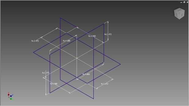 Así que una vez creado el rectángulo en un plano de coordenadas (decir xy), hacer dos rectángulos más, con las mismas dimensiones en los otros dos coordinar planos (yz y xz). Observe que hay sólo una manera de hacer un rectángulo en un plano, por lo que los bordes no cruzan los rectángulos en los otros planos: hacerlo de esa manera! También asegúrese del origen del proyecto en todos sus rectángulos por lo que todo permanece centrada y alineada cuando cambiamos el tamaño del rectángulo.