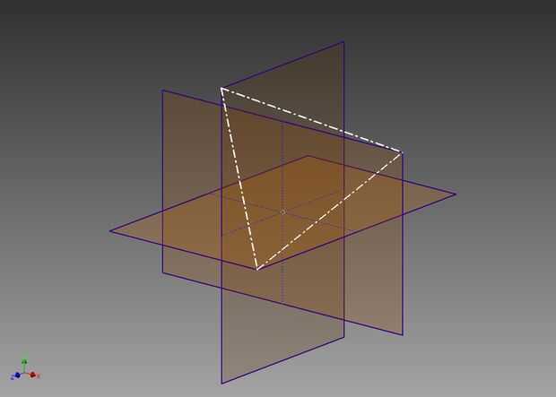 Aunque no puede verse como él, las cuatro esquinas de los tres planos darán todos doce vértices (puntos de la esquina) para el icosaedro. Iniciar un nuevo dibujo 3D y agregar líneas entre las esquinas: un lado icosaédrico será un triángulo equilátero, y cada vértice tendrá cinco vecinos. Si goof y conecte en el icosaedro es OK, solo borrar la línea de conexión.