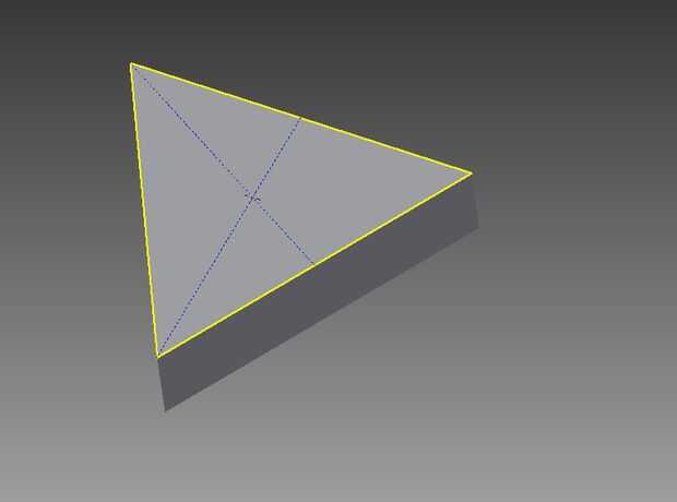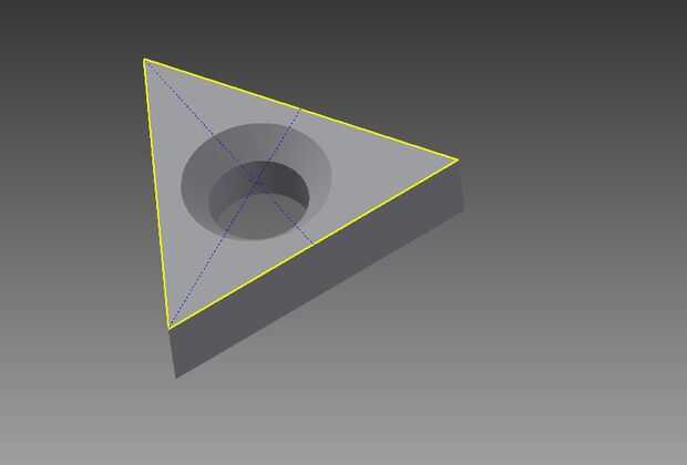 Comenzar con una nueva Asamblea y el lugar conectado a tierra su sólido icosaédrica que hiciste. Comenzar una nueva parte (.ipt) y empezar un dibujo 2D en cualquier cara entonces lado proyecto geometría de las tres de la cara en el bosquejo. Luego puede sacar ese triángulo en una cara sólida. Se sugiere usar el mismo truco para poner un agujero avellanado en la cara por lo que se puede decir que es hacia fuera (es importante!). Caer un punto en la intersección de algunas líneas de construcción perpendicular si desea que el agujero de centrado (puede no importa).