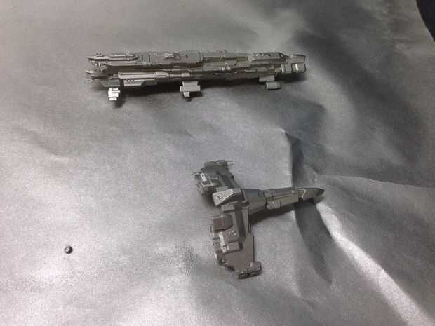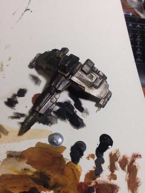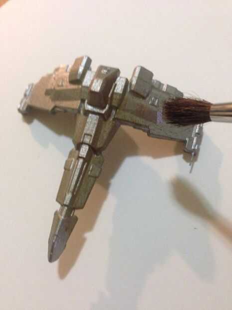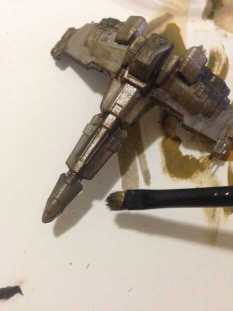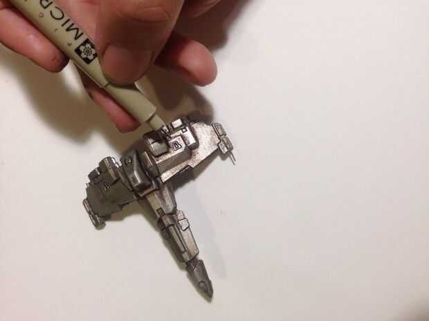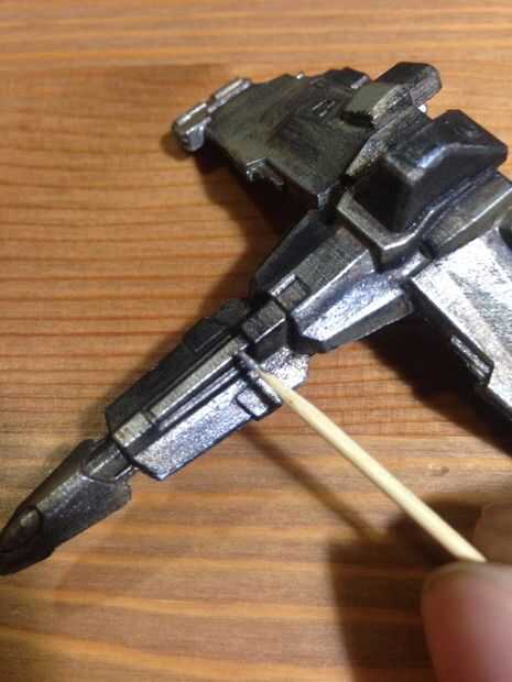 2. Aplique pequeña cantidad de acrílico negro + gris con la punta del pincel viejo. se centran en los rincones y grietas en el modelo. Esto imita la suciedad y grasa que construyen para arriba sobre la nave.