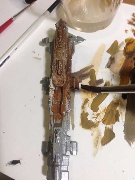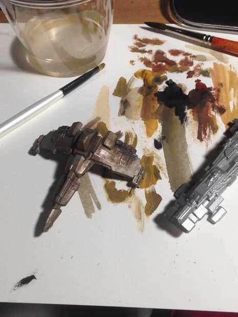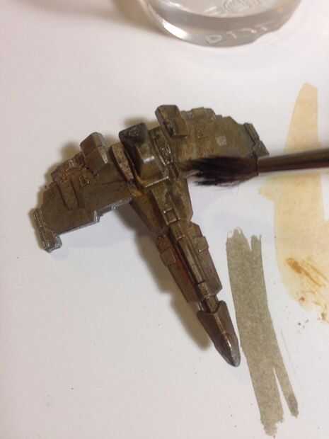 1 .apply una capa acuosa de amarillo ocre y Siena quemado todo el modelo. que alojarte durante unos minutos y luego suave azote la pintura apagado con toalla de papel. Esto va a cambiar el tono del modelo a ligeramente oxidado