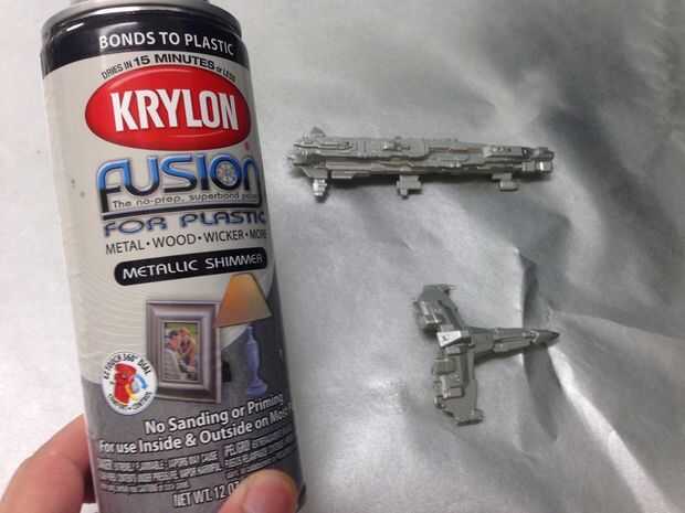 Deje que el modelo seco y limpio. Aplique spray de brillo metal marca Krylon. Escojo este spray porque se aplica uniformemente y el acabado metálico es muy realista, no demasiado aburrido no demasiado brillante. Después de una buena capa de aerosol metálico está listo para la técnica de envejecimiento.