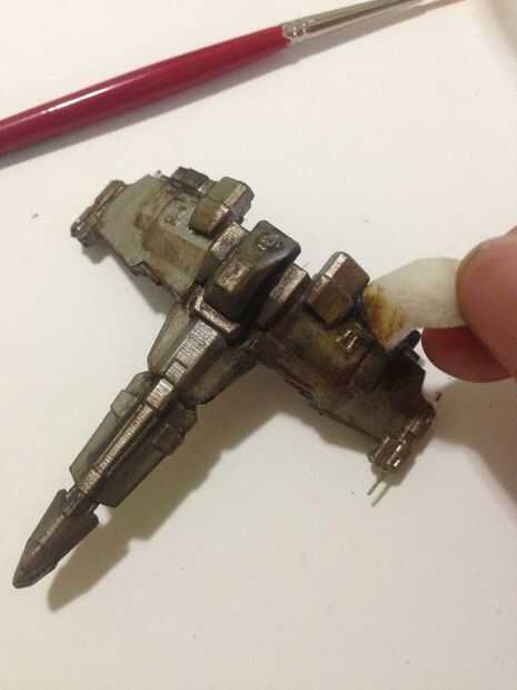 Hay muchas técnicas en intemperie y visual efecto. el modelo de nave espacial se considera muy fácil de aplicar. el fundamental es acumular capas de color que imitan la pátina que se convirtió en la metal en años de exposición al medio ambiente. Usé pincel viejo, marcador permanente y toalla de cocina para hacer el truco.
