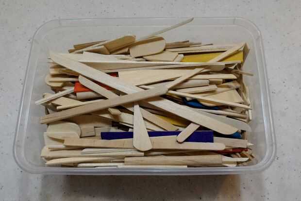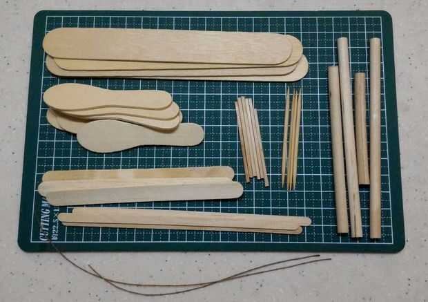 Principales materiales utilizados para esta build incluyen cucharas de Copa de helado madera gruesa (de la carlinga en forma de bola), depresor de lengüeta de tamaño palos (para los paneles solares) y tacos cuadrados de palillos de dientes pequeños (para el soporte de ala del panel solar, cañones láser, TIE fighter ion coche, panel solar ejes de centro y pabellón centro apoyo). Agujas de pino se utilizaron para la cubierta/armazón. Otros materiales provenían de mi caja de 'repuestos'.