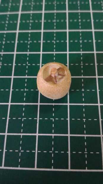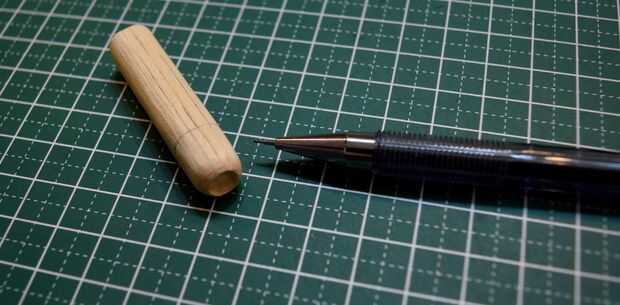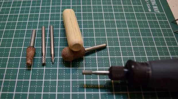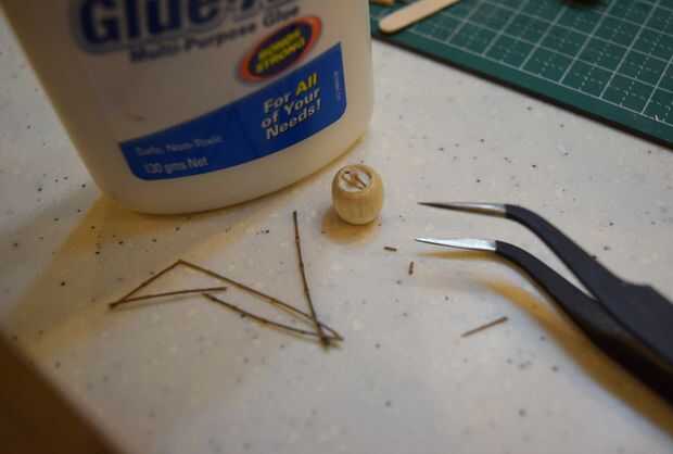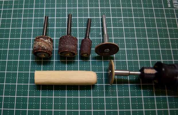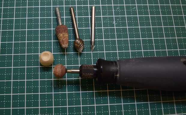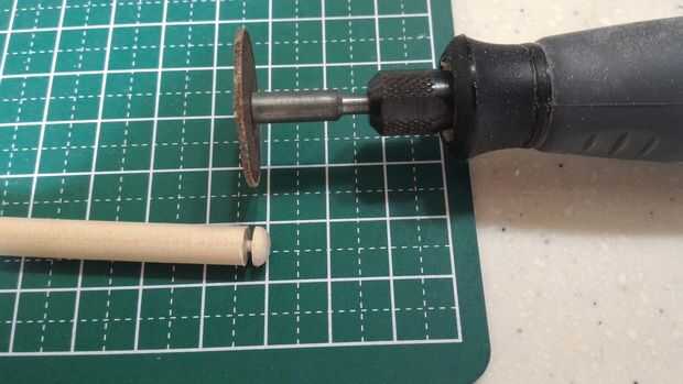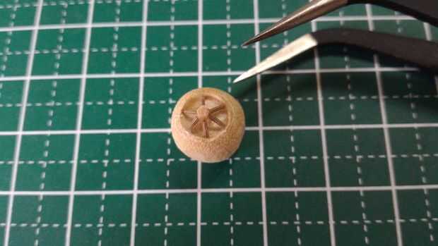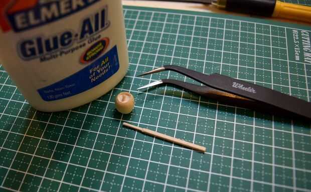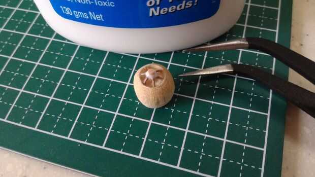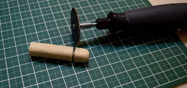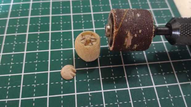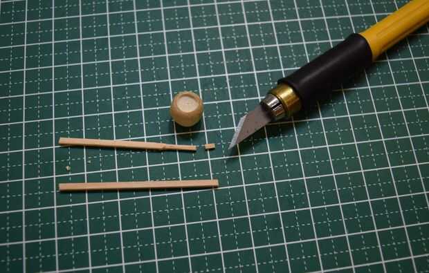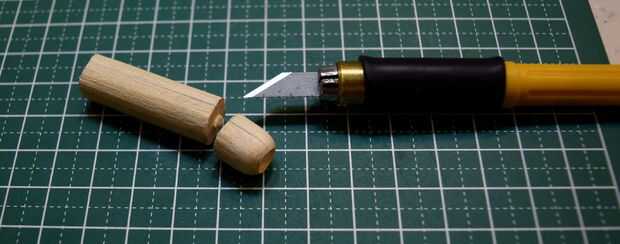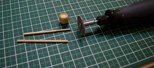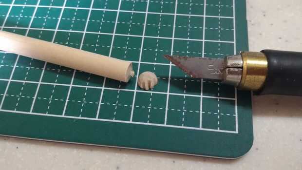 La escotilla de acceso que será pegada en la parte superior del fuselaje se hizo del borde redondeado de una clavija de madera. Una muesca cerca del final de la pieza redondeada fue hecha usando un accesorio de la rueda de corte estándar en un Dremel 3000. Tuve cuidado de no separar completamente el extremo para proporcionar palancada en la fabricación de tres muescas horizontales en el extremo redondeado. Después de que las muescas horizontales fueron talladas con el uso de un accesorio de la rueda de corte estándar, la pieza terminada fue separada de la espiga usando un cortador Olfa.