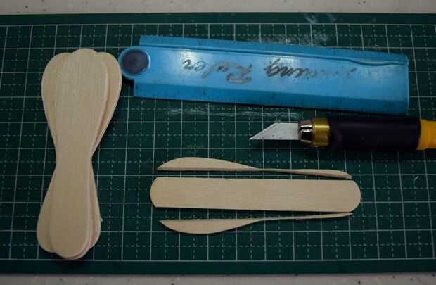 Cada fuselaje "Globo ocular" fue hecho de 5 cinco capas de helado de madera en rodajas taza cucharas pegadas con pegamento blanco Elmers. La única pieza laminada fue tallada en una pieza en forma de bala con varios dremel lijar accesorios (lijadora de tambor grueso/fino 1/2 pulgada y lijadora de disco grueso/fino). Perforé un orificio piloto de pequeña en la punta de la bala con un accesorio de corte de alta velocidad #125 para la vista del pabellón. El agujero fue hecho más grande con un óxido de aluminio #911 y #953 piedra accesorios de pulido y acabado con una fresa de alta velocidad #194 y #83702 carburo de silicio pulido piedra archivos adjuntos en una herramienta de la moto. Todo el fuselaje fue cortado de la pieza en forma de bala única, utilizando un accesorio de la rueda de corte reforzado.