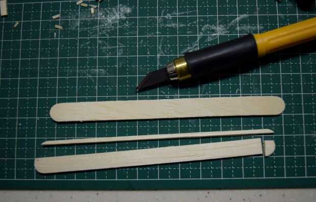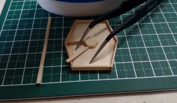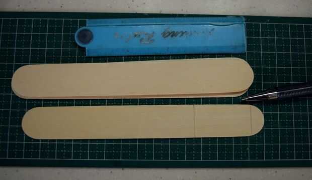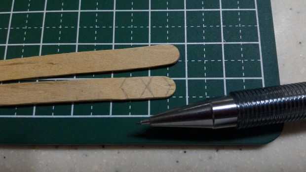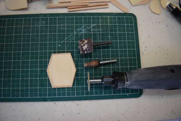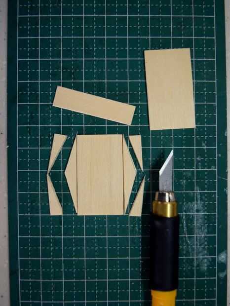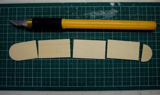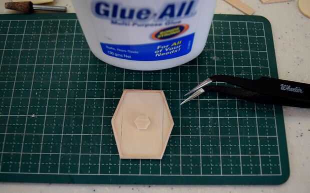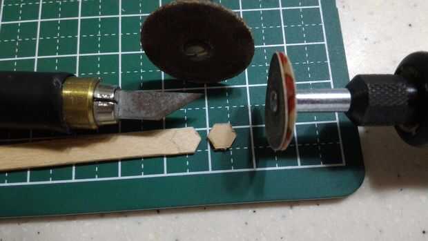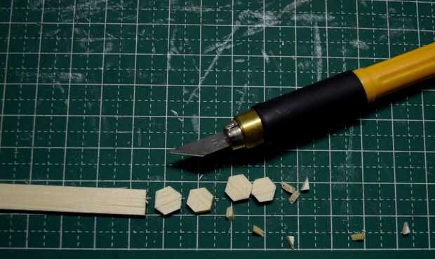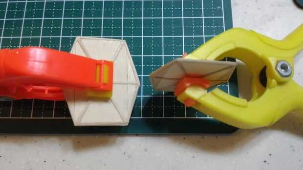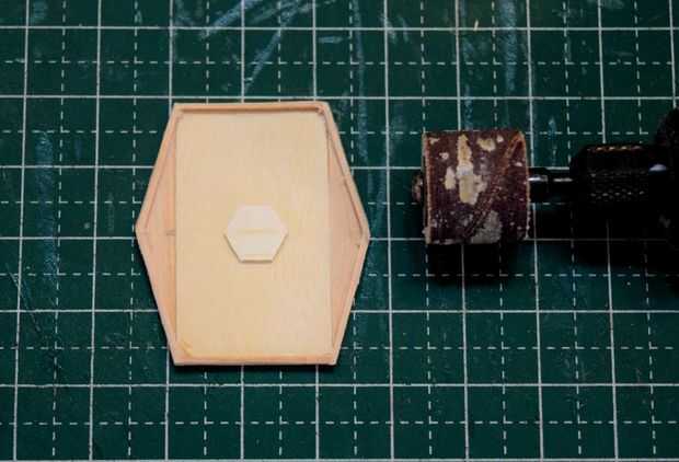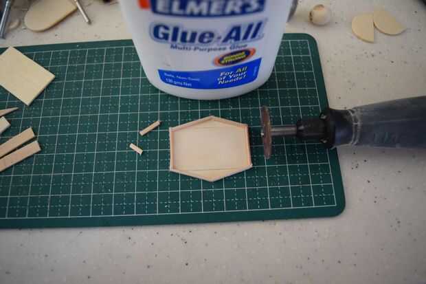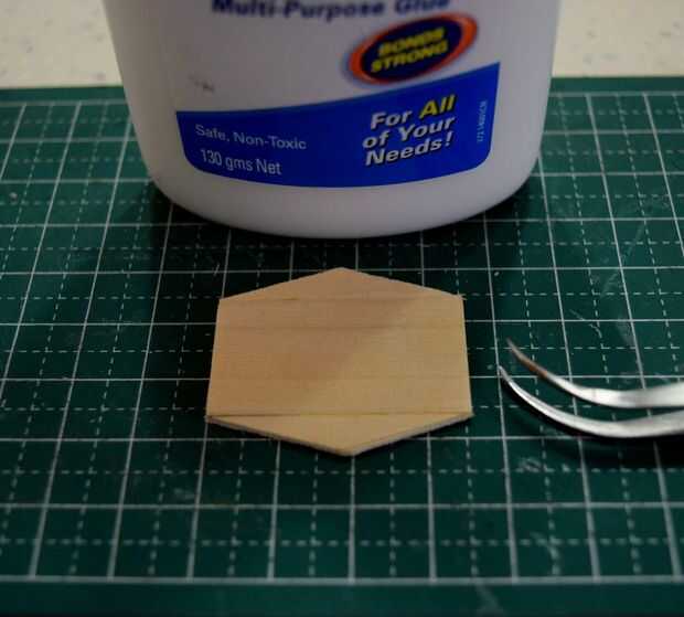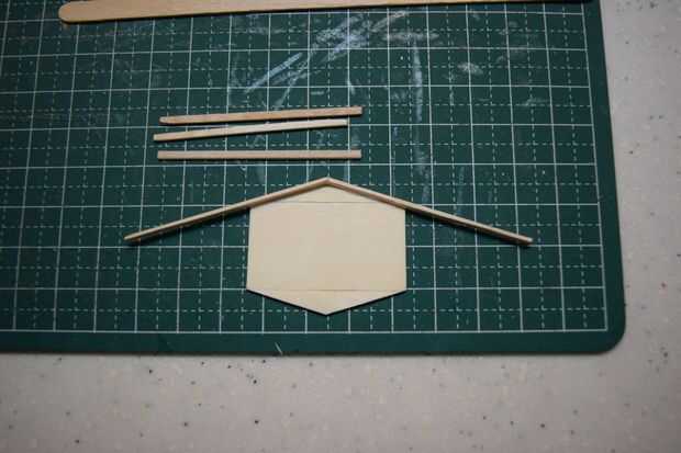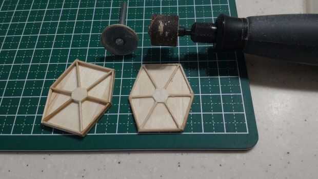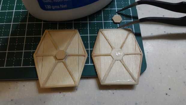El centro de soporte en forma de hexágono se redujo de tamaño regular popsicle palos de mi caja de repuestos con el uso de un cortador Olfa. El refuerzo de centro fue pegado en el centro de ala asegurándose de que las esquinas del hexágono se alineen con las esquinas del ala. Tiras de tacos cuadrados estaban pegadas de las esquinas del soporte del centro a las esquinas del ala. El ala con las llaves podían seque durante la noche para asegurar la máxima adherencia. Las llaves fueron enarenadas entonces utilizando un accesorio de lijadora de tambor grueso / fino de 1/2 pulgadas en una herramienta de la moto. Estos pasos se repiten para el otro lado de cada ala.