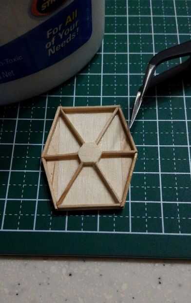 El panel solar TIE 'wings' se hicieron de 3 tres pedazos de palos medianos de depresor de lengua en rodajas. El tamaño y forma de las piezas fueron modelado después de los esquemas escalados descargaron de internet. 2 dos triángulo en forma de piezas estaban pegados a la pieza central a la forma del hexágono familiar del panel solar 'wing'. Después de que el pegamento seque, la superficie de la pieza terminada fue lijar utilizando un accesorio de lijadora de tambor fino 1/2 pulgada para que sea más delgado.