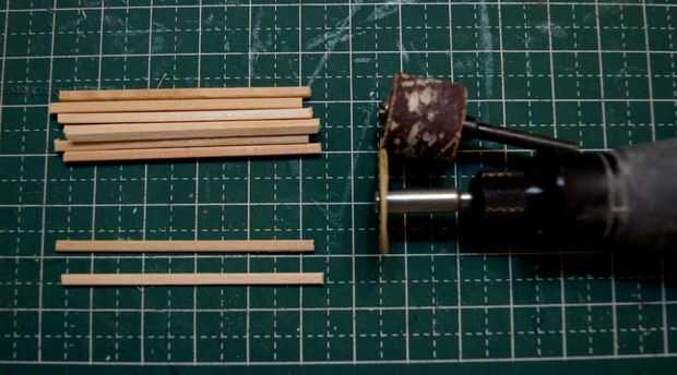 Los apoyos de ala y marco de panel solar 'alas' se hicieron de pequeño, cuadrados tacos lijadas en tiras delgadas utilizando el accesorio de lijadora de tambor 1/2 curso fina en una herramienta de la moto. Cada franja fue cuidadosamente pegado en cada borde de las seis aristas del ala del panel solar. Este paso fue hecho en ambos lados de cada ala.