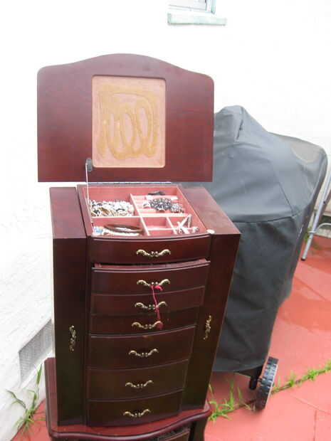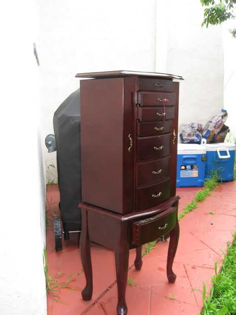 Tener un armario de joyas antiguas, normalmente puede puede encontrar uno en una tienda de segunda mano o craigslist. Mina fue dado a nosotros por un amigo (nuestro le faltaba un espejo en el interior la tapa superior).