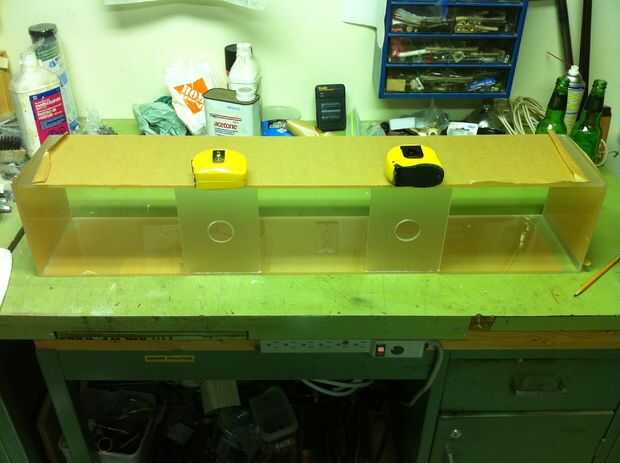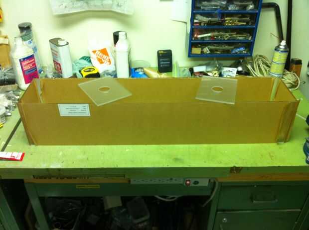 Unir todos los componentes y dejar curar completamente durante la noche. La superficie de la hoja de acrílico debe quedar hacia el exterior, mientras que la superficie brillante debe permanecer en el interior de la lámpara. Posicioné el 5 "x 7" piezas de acrílico tal que los centros de agujero (por lo tanto bombillas) estaban en 1/3 y 2/3 posiciones a lo largo de la longitud de la lámpara (aka uniformemente).