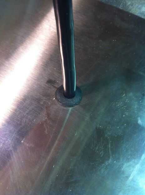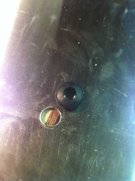 Los agujeros para los cables de luz fueron perforados 18" aparte, centrado en la placa. ojales de $0,50 fueron instalados para proteger el cable de la lámpara. La bodega restante fue perforada en el centro de la placa.