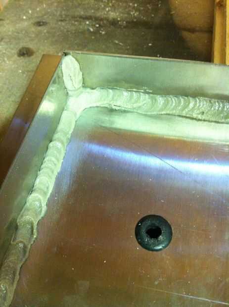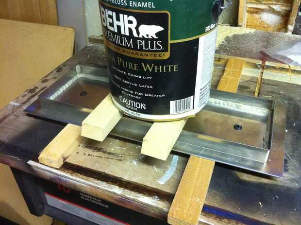 La tira de 1 "x 42" de acero inoxidable estaba doblada en un rectángulo de 5" de ancho por 16" de largo y coloca aproximadamente 1" de cada borde de la placa. PL Premium se usa para pegar la 'cerca' a la placa de acero inoxidable. Esto es necesario para proporcionar rigidez a la placa. Sin esto, la placa se doblaría bajo el peso de la lámpara.