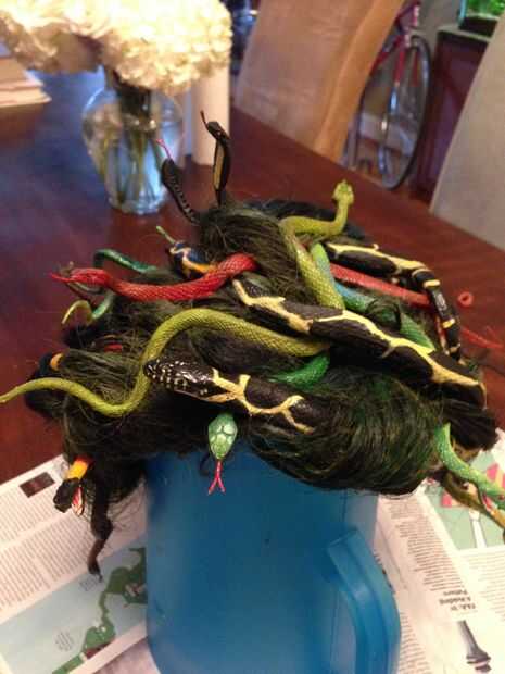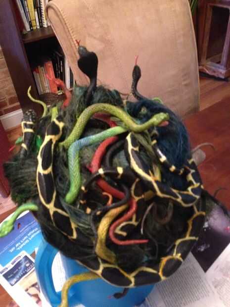 Llevó una peluca vieja, barato, negro de uno de mis antiguos trajes básicamente destruyeron e hicieron lucir bien otra vez con algunas serpientes.