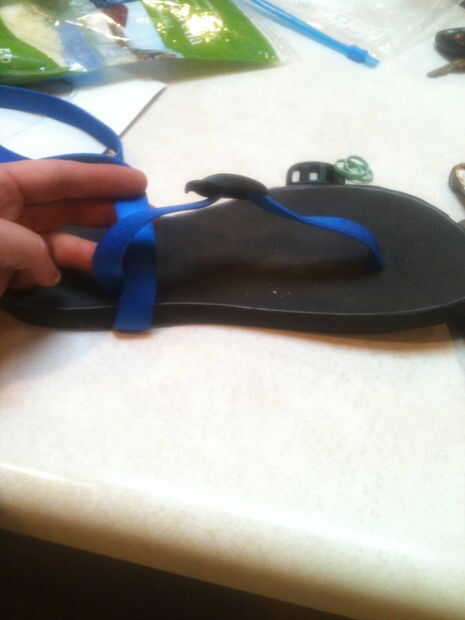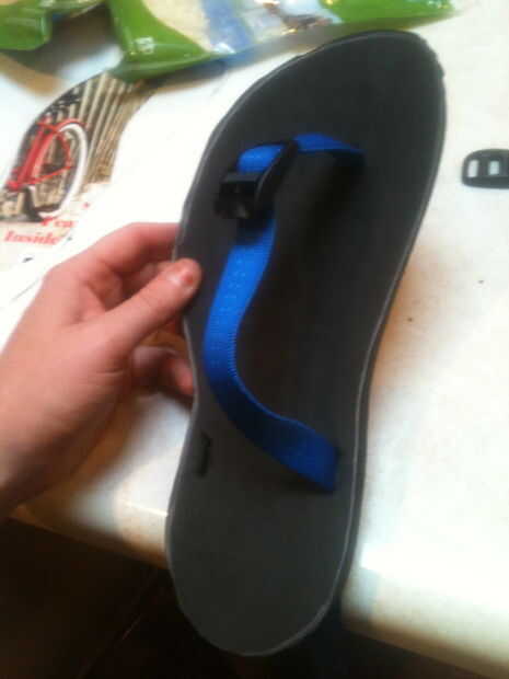 Puso su pie en la sandalia y mueva la escalera para que se sienta en su empeine.
