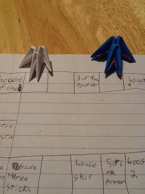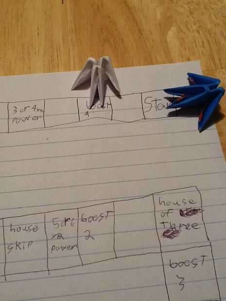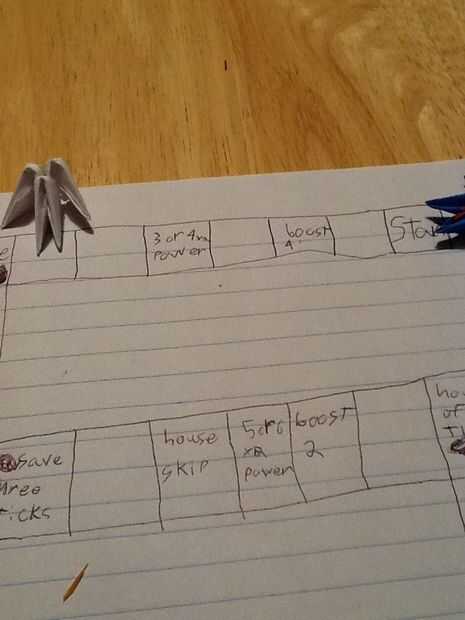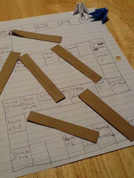 Al azar decida qué jugador irá primero. A partir de todos los peones en Inicio, tirar los palos y contar cuántas líneas tienes. En la primera foto tengo 2 barras con líneas. El jugador 1, que es blanco y va primera pasará 2 cuadrados y tierras impulso 4 (cuadro 2). Porque las tierras de p1 en potenciar 4 pasan 4 plazas más (cuadro 3). Ahora es turno del jugador 2 y mezcle un 3, por lo que se mueve acordingly (cuadro 4). Ahora toca de p1 lanzan un 1. Porque p1 está en la casa de 1 debe lanzar un 1. Suponiendo que tiran una se trasladarán a la plaza en blanco más cercana. En mi tabla tengo 5 tipos de power-ups: potencia, x2 poderes, revertir las direcciones, excepto palos y salta de la casa. Puesto que ya he explicado aumenta la muevo a x2 poderes. Cuando aterrizas en un x2 poder si su próxima vuelta te tiro un número en el cuadrado se mueve 2 veces el número rodado. Si aterrizas en un 1 o 2 x2 de la energía si saca un 2 se mueve 4 plazas. Si aterrizas en dirección contraria a su próxima vuelta moverá hacia atrás en vez de hacia adelante. Si caes en un save pega te pueden mantener como muchos palillo como dice en la Plaza y volver a iniciar los palos restantes. Si la tierra en un salto de la casa si su próxima vuelta te trasladan una casa ir a la siguiente casilla en blanco.