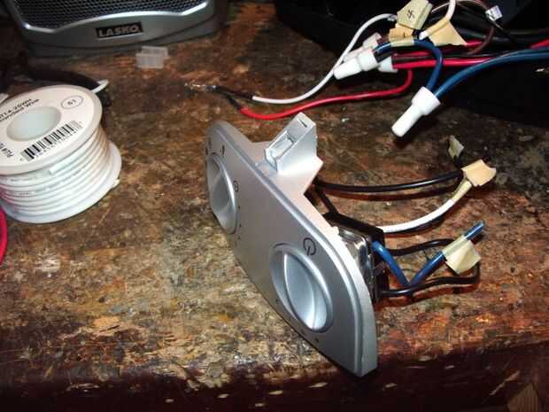 Mi plan inicial era quitar los controles del dos calentador y montar en la parte delantera de la caja Kenmore cerca del fondo, pero una vez vi cómo se hicieron los nuevos controles del calentador, he decidido contra él. Estos controles se formaron básicamente en una unidad de control (foto 4) y no eran fácilmente extraíble. Además, el termostato se construyó en uno de los controles, y realmente lo necesitaba por encima de los elementos de cerámica (alineados con un respiradero que se construyó en la carcasa trasera del calentador de cerámica). Así que, decidí montar en la parte superior de la Kenmore. Sabiendo que necesitaría cables más largos, marqué cuidadosamente los cuatro cables que tendrían que ser cortado y empalmado con las lengüetas de la cinta que se muestra en la foto, entonces yo cortar.