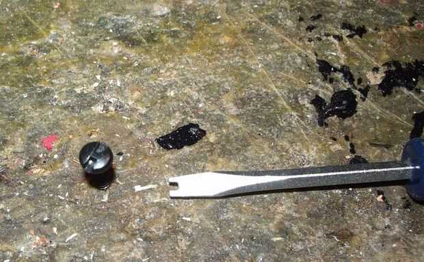 Desmontar el calentador nuevo era fácil--sólo cuatro tornillos celebrada frente a la parte posterior. Un tornillo, sin embargo, fue un "tornillo de seguridad," diseñado para mantener a la gente como tú y yo de llegar a los interiores. Afortunadamente tuve mi fiel "herramienta de eliminación de tornillo de seguridad personalizado" (ver foto 2), que trabajó como un encanto. Sí, tal vez yo he anulado las garantías antes de...