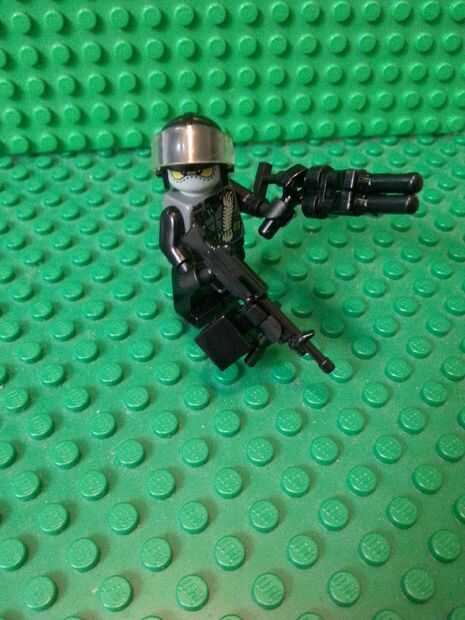 algunas armas y equipoPaso 1: Minifig Mismo figura como la primera versión.Paso 2: Visión nocturna! Agrega una mirada impresionante. Hecho de un par de anteojos que solo tiene piezas al azar pegados sobre ella.Paso 3: Chaleco y cuchillo Chaleco es si