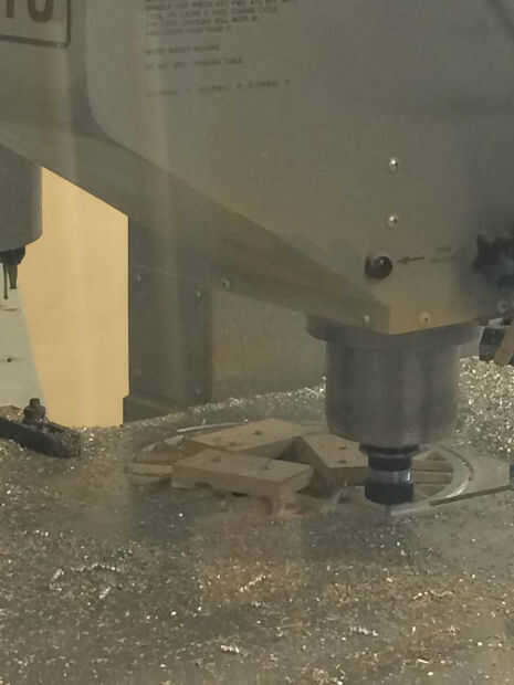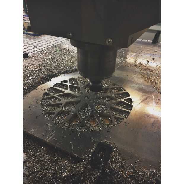 Después de completado el proceso de mecanizado del patrón, tres bloques de chatarra de madera se atornillan a la madera, colocando el material entre ellos. Este procedimiento impide que el material durante el proceso de mecanizado de la llanta. El mecanizado de la rueda pequeña tomó un total de 68 minutos y la rueda grande tomó 4,5 horas.