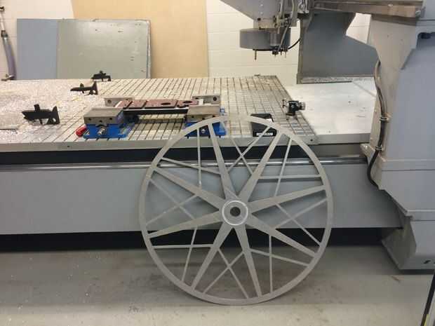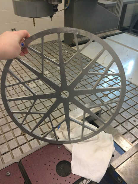 Uno de los mayores desafíos en este proyecto fue las ruedas. Tamaños de rueda de cuarto de penique generalmente varían de 40 a 60 en. En este día en edad, una rueda de este diámetro no es generalmente fácil de encontrar. Muchas ideas fueron sugeridas como mecanizado hacia fuera del borde y haciendo radios individuales atornilladas a la llanta, o encaminamiento de un diseño de la rueda y entre la llanta y radios como una sola pieza. Para este proyecto, encaminamiento hacia fuera de la llanta y radios como una sola pieza era mejor adaptado debido a la eficiencia de tiempo. Antes de nada puede mecanizarse, un diseño está en necesidad. Para este proyecto, el diseño de radios fue inspirado por una fotografía de una rueda de moto de truco. Un dibujo del cad fue creado entonces utilizando CATIA. Parte del concepto detrás de este diseño era hacer una bicicleta ligera. Originalmente la idea de utilizar fibra de carbono como el único material para este proyecto fue un gran deseo, pero no realista en el lapso de tiempo dado. Por lo tanto se utilizó aluminio. Un programa CNC se generó entonces con CATIA. Dentro del programa, se utilizó un molino de extremo de 3/8" para rebaje todo el diseño de la rueda. Posteriormente se realizó una pasada de acabado utilizando un molino de extremo de 5/16" para lograr los radios interiores. En cuanto a configuración, un trozo de madera (más o menos del mismo tamaño) se sujeta debajo del material a la mesa. Este procedimiento acomodado para la separación de corte. Se utilizaron siete abrazaderas de correa para sujetar el material a la mesa. El uso excesivo de las abrazaderas se necesitaba para mantener el material seguro porque si cualquier movimiento ocurrido durante el mecanizado, se habría lanzado fuera de la alineación de la rueda.