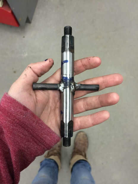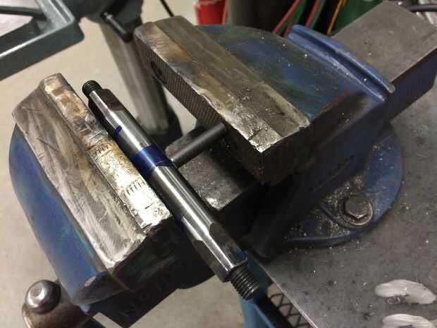 Una vez que finalizaron las ranuras, los pernos necesitan para soldar en el eje. Durante este proceso, fue muy importante que los pernos necesitan esté perfectamente alineado y no hablar directamente porque fácilmente podría deshacerse de la alineación completa de la moto. Para sujetar los pernos, el axel y pin fueron ambos afianzado con abrazadera en el tornillo entonces tachuela soldada en su lugar. El mismo proceso se aplicó a la otra patilla pero había colocado adyacente al primer pin 180°.