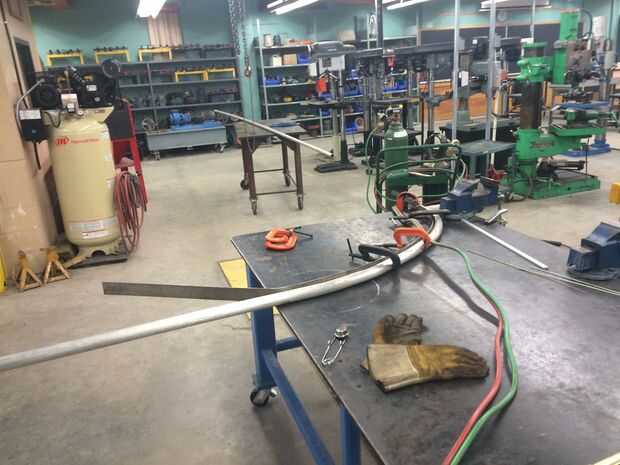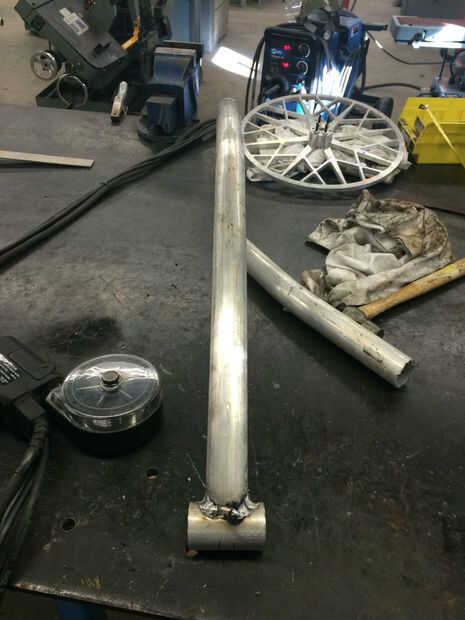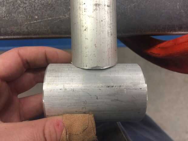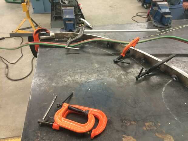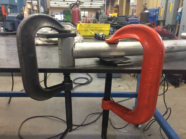 Para asegurar que el cuerpo perfectamente se centraba en el conector, cuñas y cupones de soldadura espesor ¼" fueron utilizados para dar cabida a la diferencia de altura. Abrazaderas tipo C fueron utilizado para mantener el cuerpo hasta la mesa, así como la pieza de conexión en su lugar durante el procedimiento de soldadura. Esta operación fue luego imitada en el otro extremo, pero cambiando la orientación del conector vertical en lugar de horizontalmente.